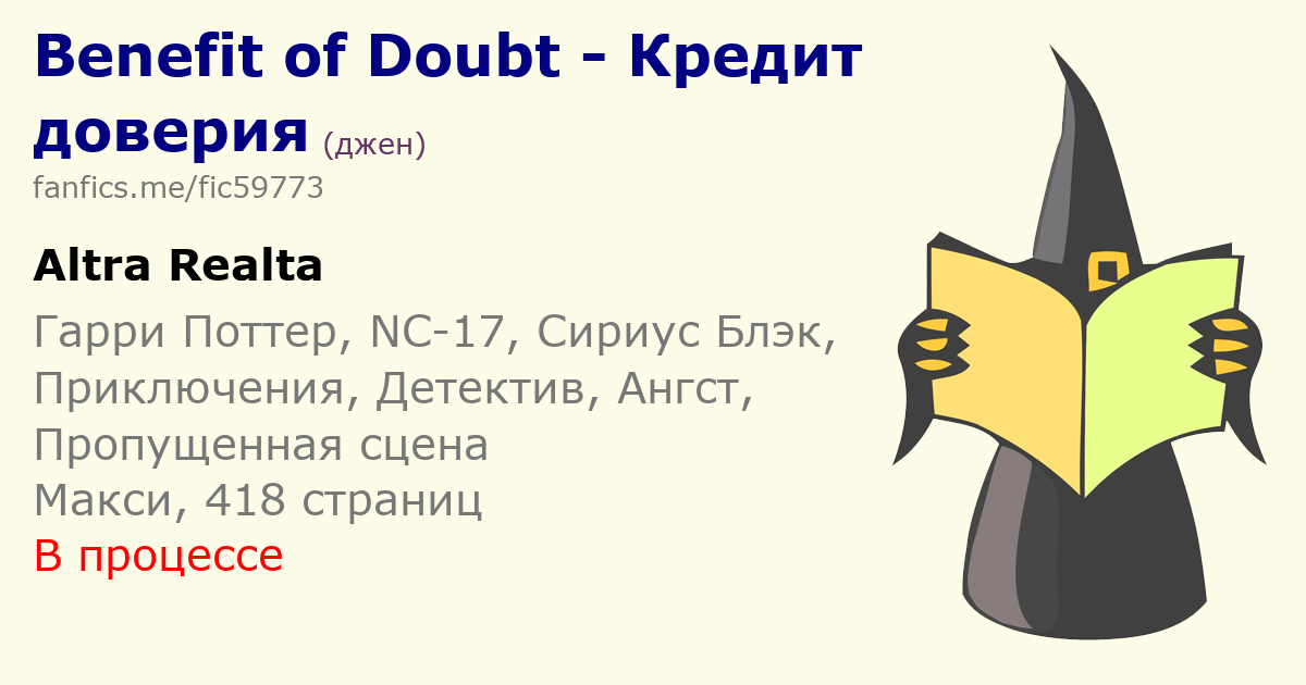 | Altra Realta Он один же Тот самый, который тут уже чёрт знает сколько не появляется, а свой фик забросил в 18 году?Не-а. Я вспомнил, где-то был статус "заброшено" - вот это оно. Ну вот была бы тут такая метка, в смысле, такой статус — да Ктулху ради. Но тут есть только впроц, заморожено, завершено. Аналогично на фигбуке. И аудитория «здеся» и фигбука понимает их одинаково: впроц — в работе, заморожено — проды не будет, как минимум в обозримом будущем; отличие здеся от бука в том, что здеся заморозка наступает автоматически, а тама впроц висит годами и десятилетиями, потому что авторы кладут болт на свои тексты.Кажется, на старом Хогнете. 1 | |